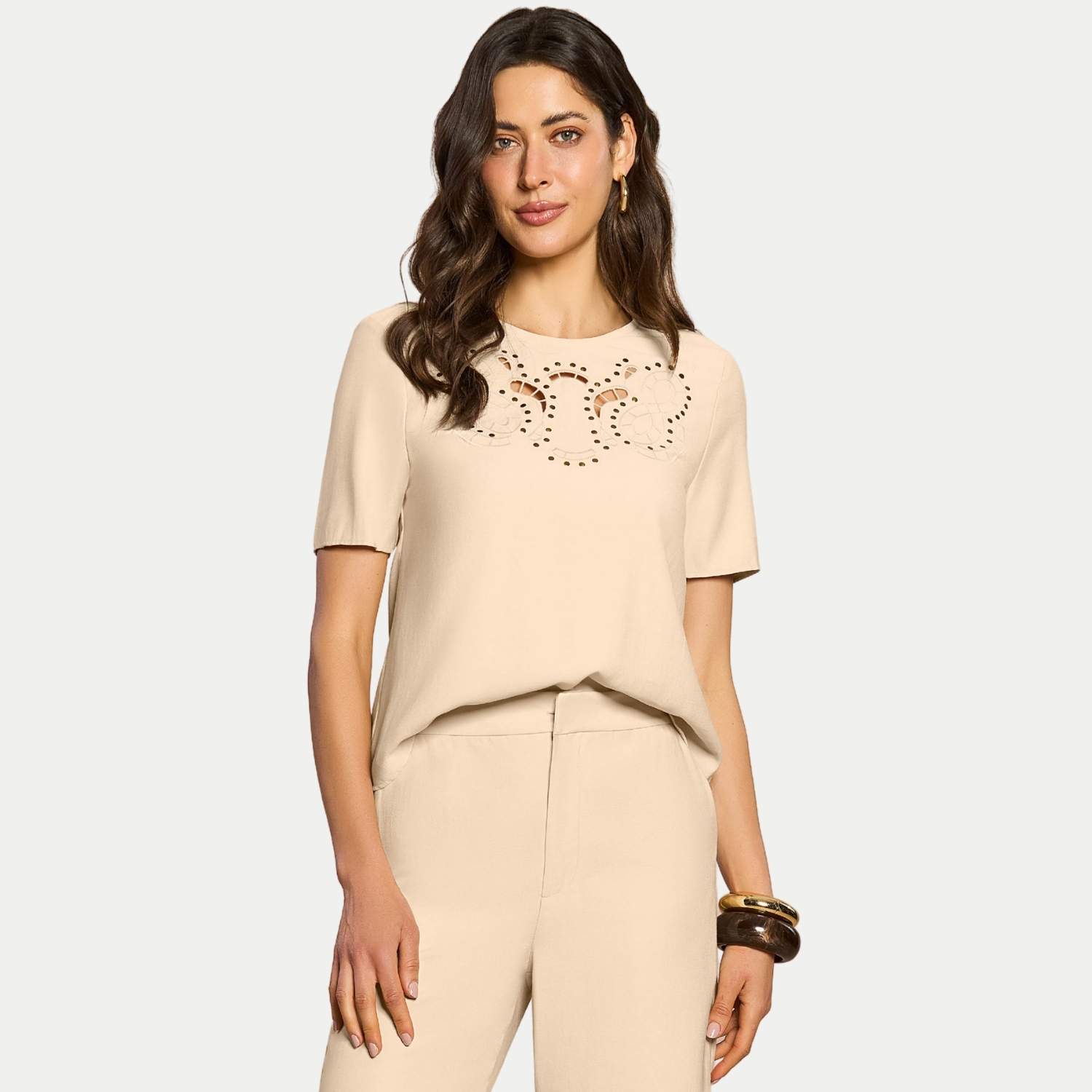 BLUSA DOCE TRAMA MANGA CURTA T-SHIRT ALGODÃO BORDADA BEGE FEMININO ADULTO