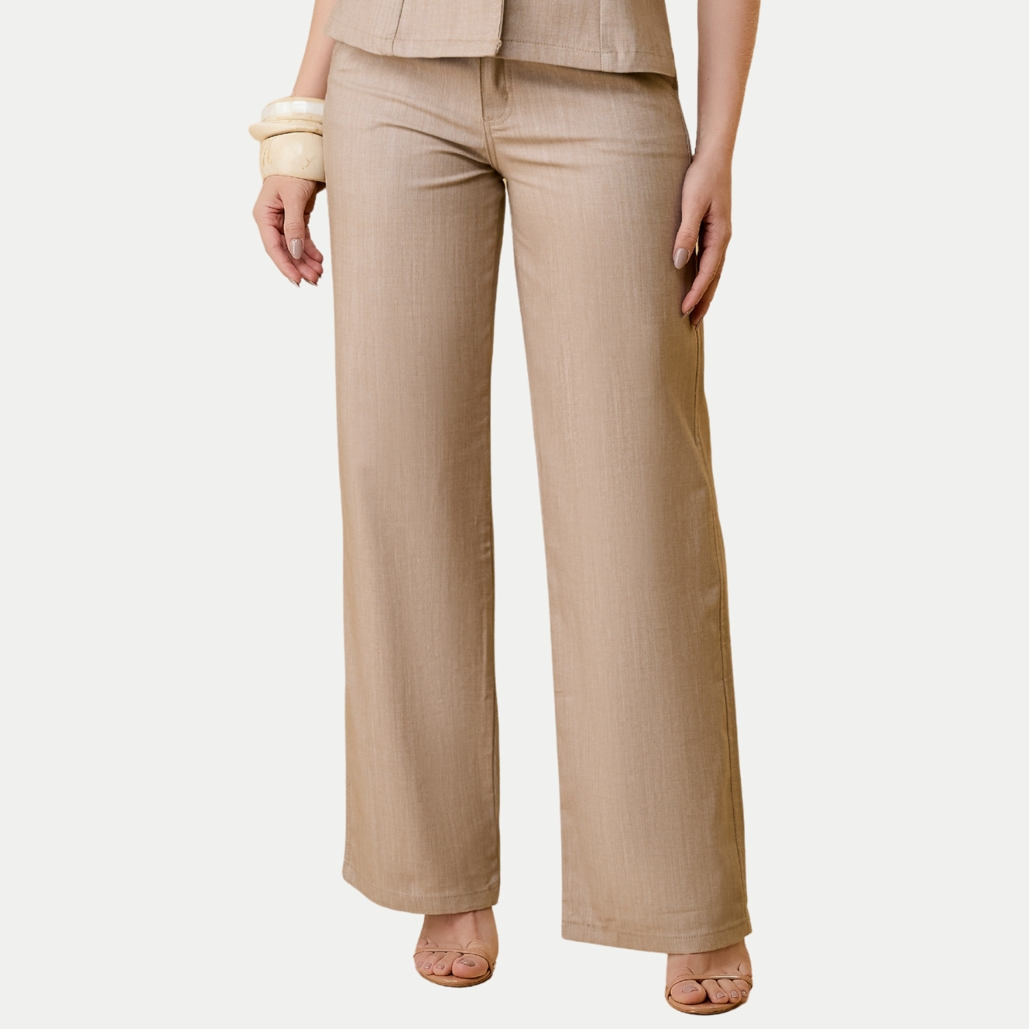 CALÇA OGNUS BRIM COM ELASTANO BEGE WIDE LEG FEMININA ADULTO
