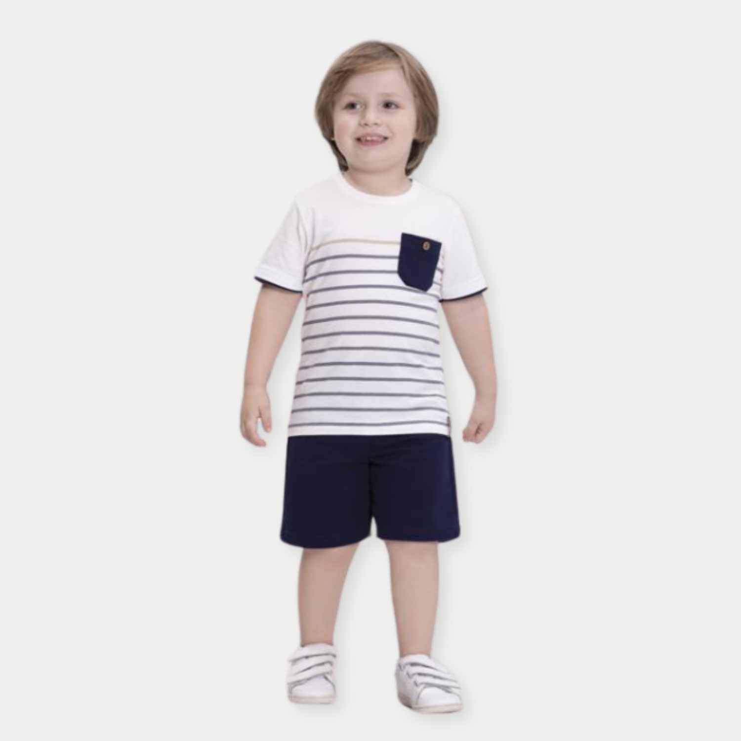 CONJUNTO VERÃO ALAKAZOO BERMUDA E CAMISETA MANGA CURTA AZUL MARINHO DE MALHA MASCULINO INFANTIL