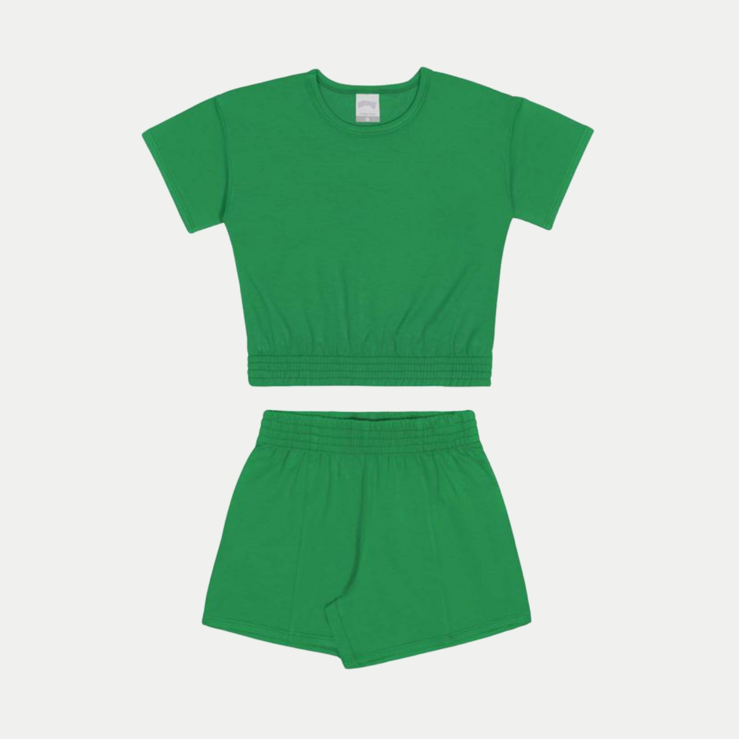 CONJUNTO VERÃO ALAKAZOO SHORT E BLUSA MANGA CURTA VERDE DE MALHA FEMININO INFANTIL