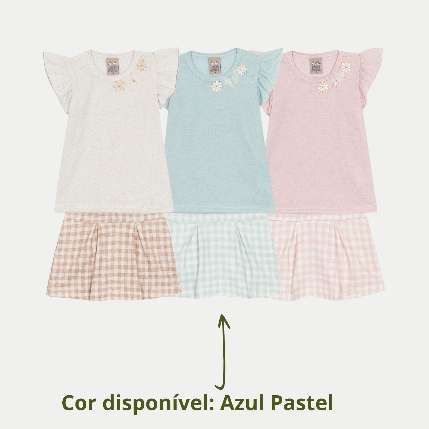 CONJUNTO VERÃO RANDA MUNDU SAIA E BLUSA MANGA CURTA AZUL PASTEL FEMININO INFANTIL