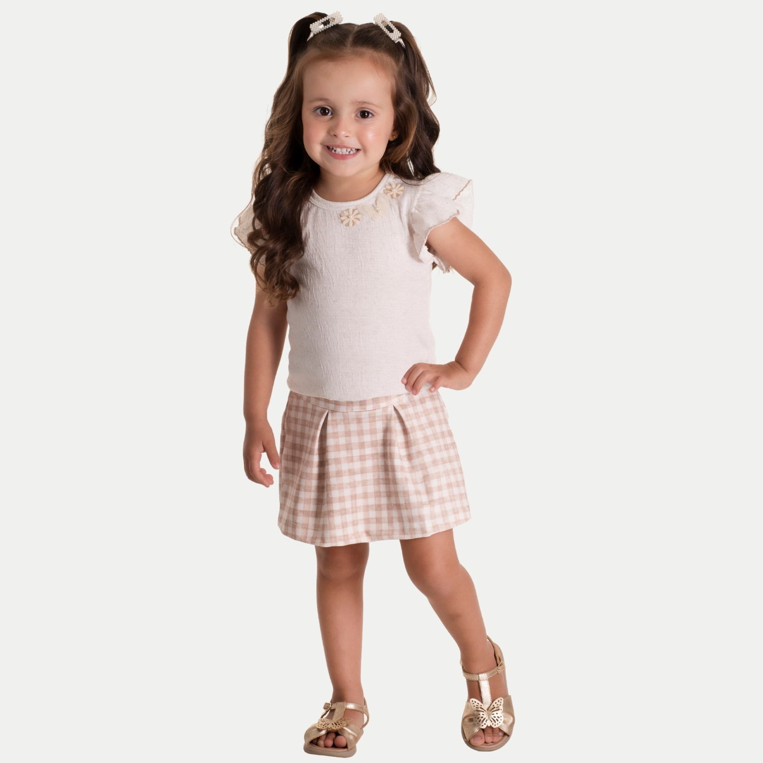 CONJUNTO VERÃO RANDA MUNDU SAIA E BLUSA MANGA CURTA DE LINHO BEGE FEMININO INFANTIL