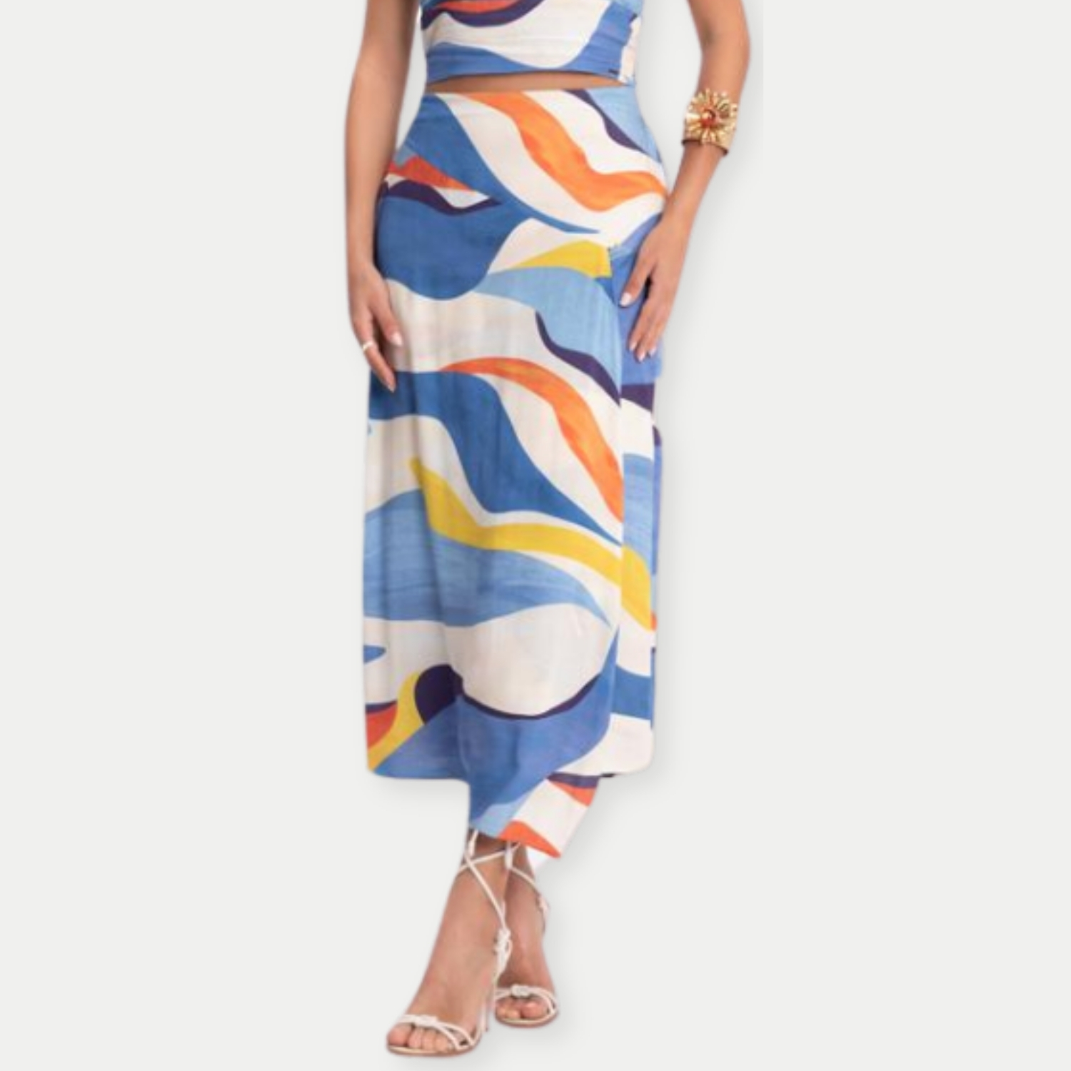 Saia Midi Chá Estampada Em Viscose Responsável. CORPO 100% VISCOSE, FORRO 100% POLIÉSTER
