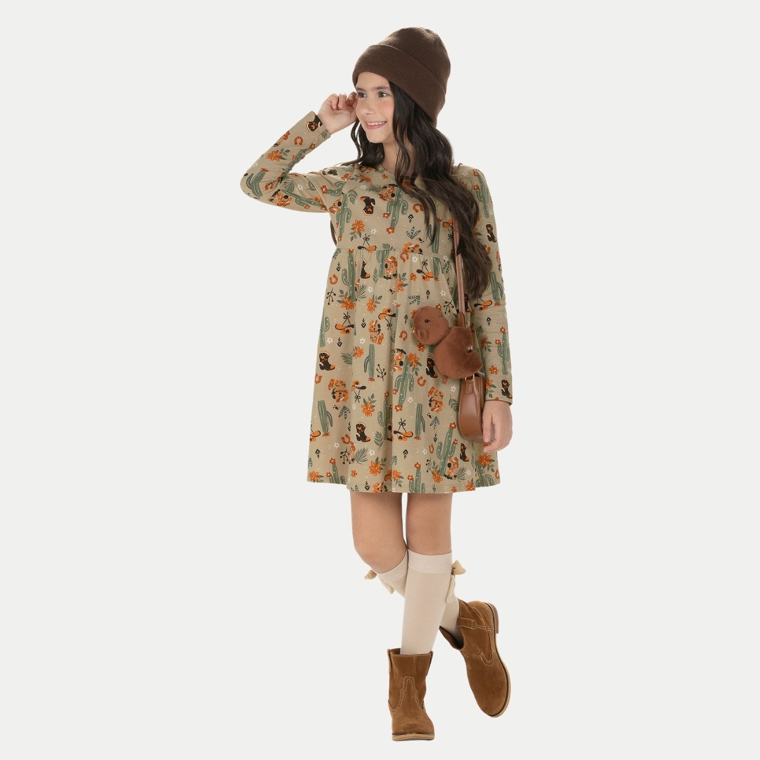 VESTIDO ALAKAZOO MANGA LONGA MALHA ESTAMPADO BEGE FEMININO INFANTIL